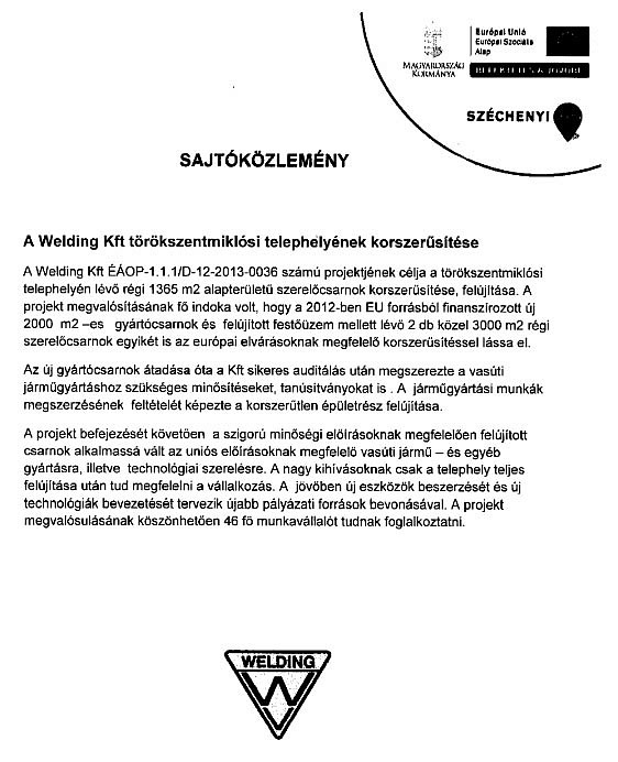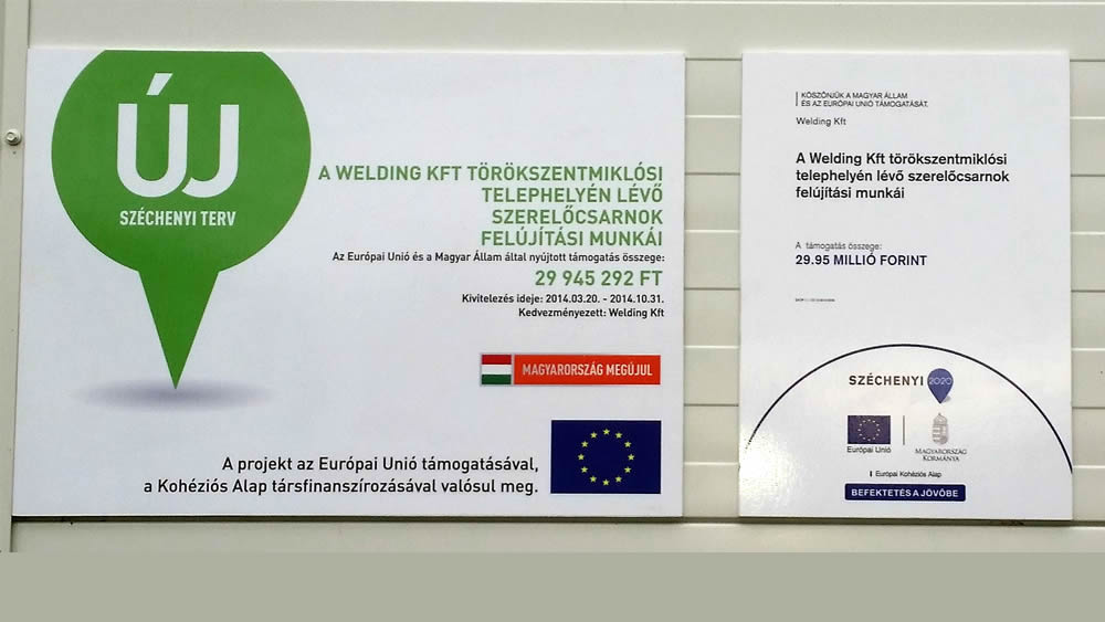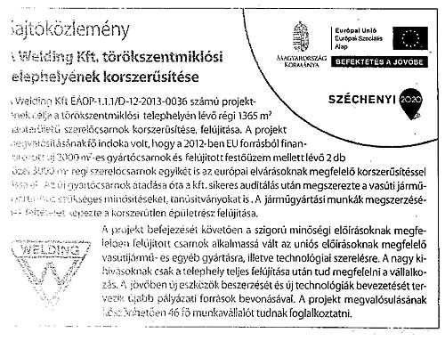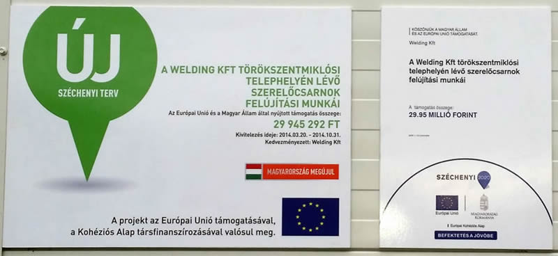 Welding Kft won a support for renewing its fitting hall located at its premises in Törökszentmiklós. The amount of the support provided by the European Union and the Hungarian State is: HUF 29 945 292.