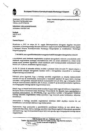 Welding Vállalkozási Kft based on the decision NGM/7568/6/2012 of the Minister of National Economy made on June 21, 2012 received a wage compensation support from Labour Center of Budapest of the amount of HUF 1 761 002.